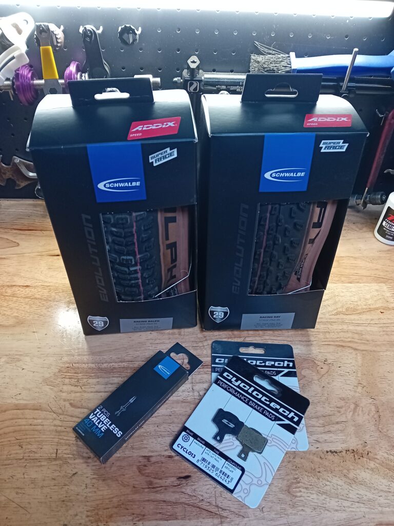 Een Specialized Enduro die is voorzien van nieuwe buitenbanden met Cushcore ineserts en nieuwe ventielen met de nodige sealant om af te dichten.