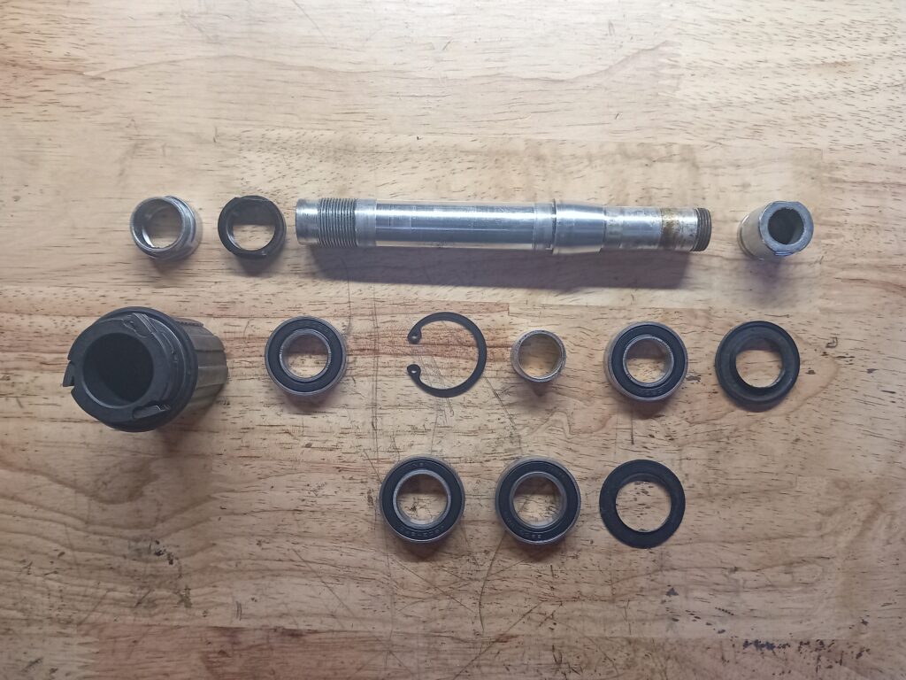 Revisie van een geveerde achterbrug waarbij alle onderdelen worden gereinigd en van nieuwe lagers en vet wordt voorzien.