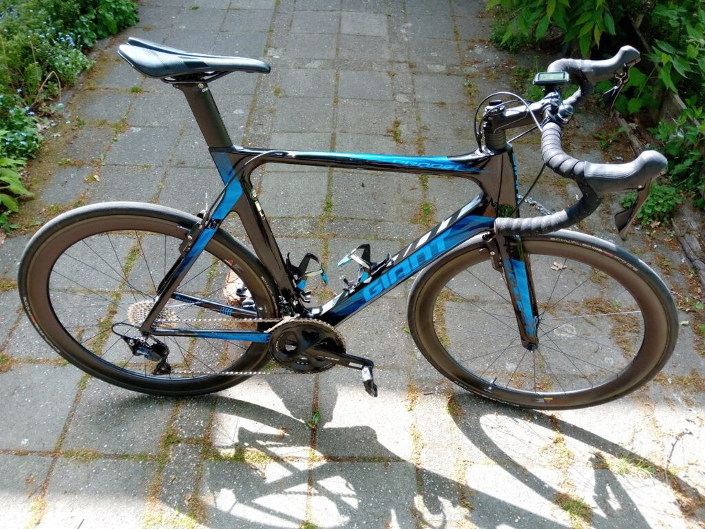 Een Giant Propel die een onderhoudsbeurt heeft gehad waarbij de complete aandrijflijn is vernieuwd en nieuw stuurlint is gemonteerd.